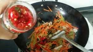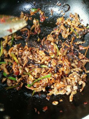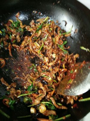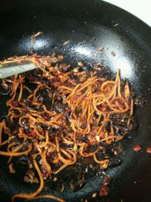 加入郫县豆瓣 ,然后加入胡萝卜丝,木耳丝,青椒丝