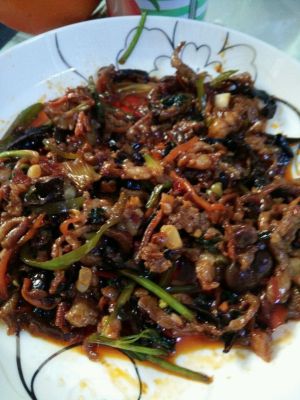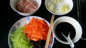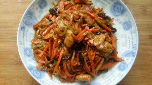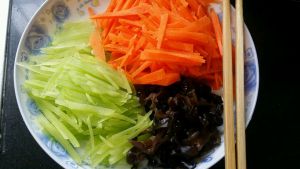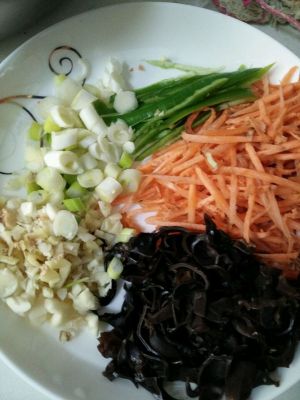 将木耳泡发 胡萝卜 青椒 切成丝,香菜切段,葱姜蒜切末