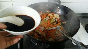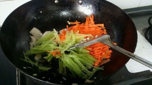 开锅后加一点点的老抽调色加入所有准备好的菜丝,翻炒均匀,出锅