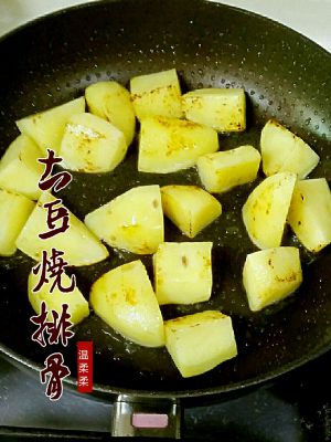 一边闷排骨一边将土豆煎香,主要是为了能更好的定型不容易烂,也可用炸的方式。
