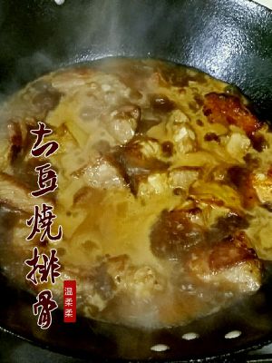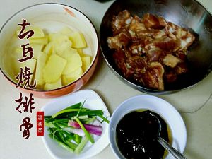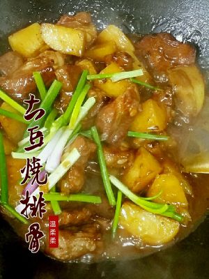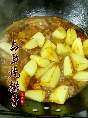 热油炒排骨。变色后,加豆瓣一起炒。加调料加水淹没排骨。加土豆