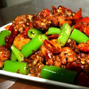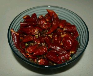 热锅加油至八成热,倒入干辣椒段,大火30秒钟后起锅