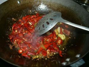 锅内热油,下干辣椒,花椒,姜蒜爆炒,依次加豆瓣酱至出红油,酱油,白糖。