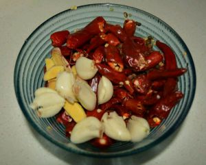 准备食材,干红辣椒切段,姜,蒜切片,花椒一大把,八角和冰糖3颗