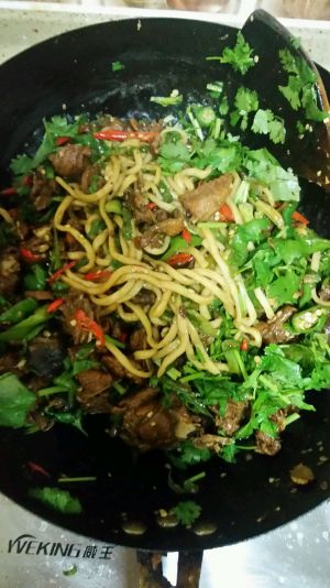 趁炖鸡肉的时候,另起锅烧水煮面条。煮8成熟捞出放入鸡汤里一起翻炒(也可煮熟面条直接装盘,铺在盘底),待面条全部吸收鸡汤的浓香加盐鸡精出锅。