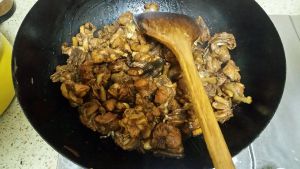 葱姜蒜炝锅,倒入鸡,将鸡本身的水分炒干,加入老抽,料酒,待鸡肉全部上色,加水炖煮,水省1/3时加醋,继续翻炒