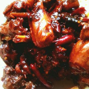 锅留底油放入姜蒜爆香,放入干辣椒花椒炒香,加入炸好的鸡丁,