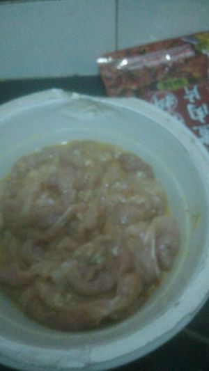 里脊肉切薄片,放入调料包内,腌肉粉,将肉腌制5分钟以上。