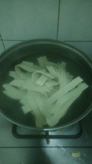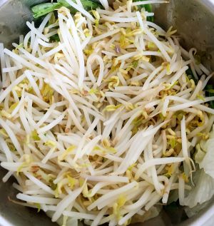 青菜(生菜、豆芽、青笋片等自由搭配)热水烫一下,也可选择放少量油炒一下,后捞出沥干水分。