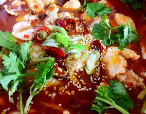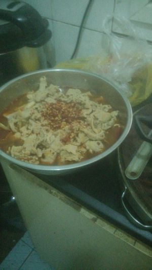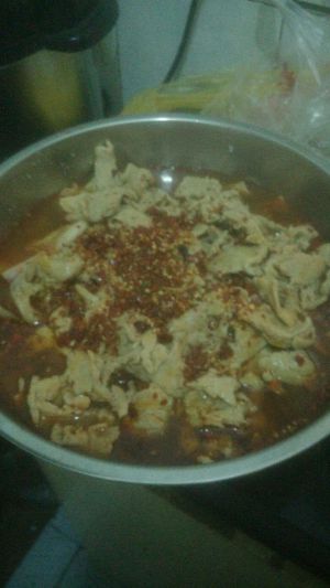 锅里加油加青麻椒烧热(也可提前将麻椒用干锅炒熟,后碾成粉末直接码在肉片上)浇在肉片上。