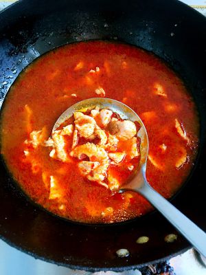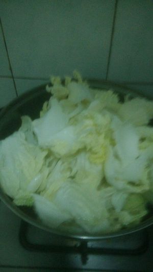 加入适量水烧开后,放入腌制好的肉片,一分钟左右即可。将肉片捞出,码到烫好的青菜上。
