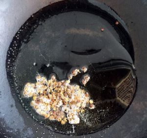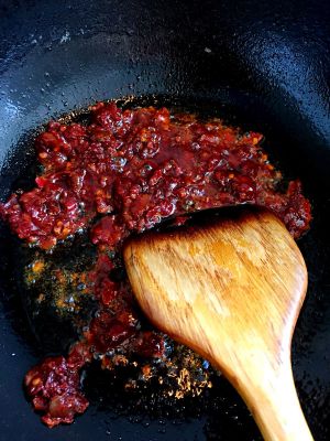 锅里放少许油,加郫县豆瓣酱炒出香味。