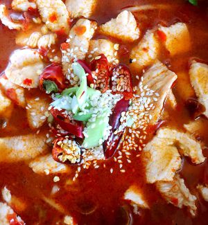 汤汁加水淀粉收汁至粘稠,浇入肉片青菜上,再码上香葱末、干辣椒、芝麻。