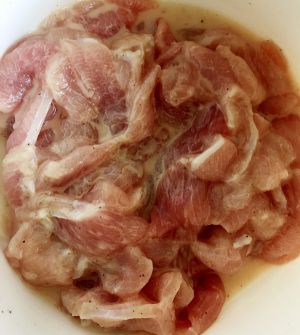 猪里脊肉切成片,料酒、胡椒粉、淀粉适量腌制一会儿。