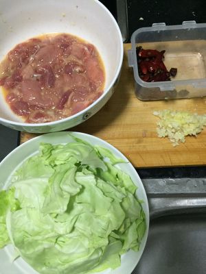 包心菜手撕片,葱姜蒜切沫,肉切片加各种调料搅拌均匀。