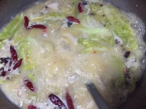 油热后,最小火煸炒葱姜蒜,豆瓣酱,辣椒酱,花椒和干辣椒,然后加入包心菜吸油,最后添水转大火烧开。
