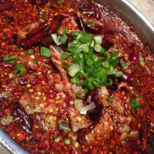 热锅放红辣椒炸香 连油一起倒入炒好的花椒粒中