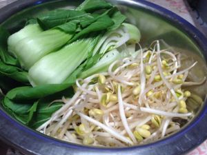 烧开水焯自己喜欢的蔬菜(我放了白菜,苦苣,油菜,生菜,油麦菜,魔芋丝,木耳,黄花菜)