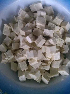 豆腐切小方块,用淡盐水浸泡10分钟,沥干水分