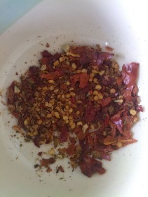 把麻椒辣椒小火炒干香捣碎,用研磨机研磨碎更好,