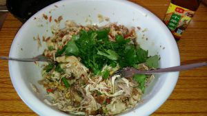 弄完之前的,鸡也蒸熟了。接下来就开始撕鸡。这里要说说撕鸡良器——叉子!!这是绝好的撕鸡武器,不烫手,不脏手,还可以随时尝下味道。刚出锅的鸡肉都可以必撕无疑。前提是,叉子的质量一定要好。撕好了鸡肉,把前面弄的配料一股脑的倒进鸡肉里,拌吧,拌吧,再加点香油(芝麻油)。饿了就开吃吧(゚∀゚)o彡゜