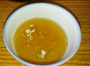 碗里舀入之前蒸鸡腿余下的鸡汤;