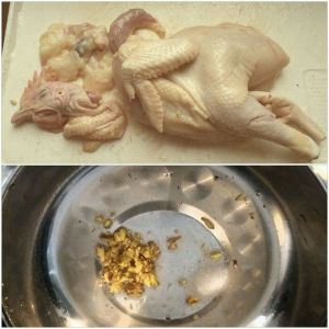 盘子里拍些姜沫,放些盐(不要太咸),兑水,把鸡清理好了放盘子里揉两下,鸡肉进味