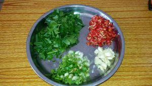 小葱,香菜,小米辣切碎与调料,百香果搅匀