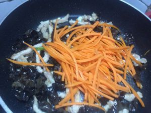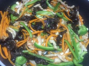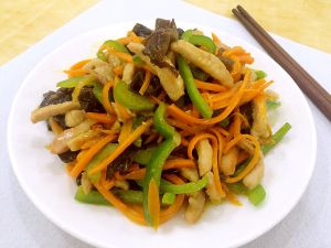 等胡萝卜丝和云耳差不多熟的时候加入青椒丝,最后再倒入刚才调好的鱼香汁,再尝一下味道,适当的进行调味,就可以出锅啦