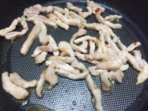 锅中下油,油的量要比平时炒菜的量稍稍多一点点,加入腌好的猪肉条,翻炒到颜色变白,可以依个人口味加点豆瓣酱