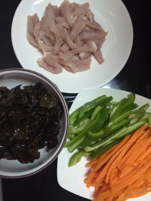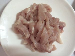 主料切丝备用,里脊肉丝用蛋清和淀粉加少许盐拌匀。