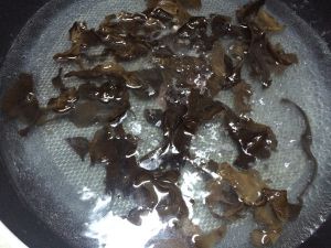 锅中加入清水烧开,倒入云耳条,焯水2分钟左右,再捞出备用