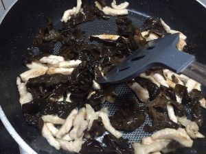 加入木耳丝'翻炒至噼啪响后'加入大葱'随后加适量盐和味精调味'关火装盘