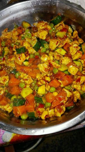 放入鸡丁翻炒均匀,用事先兑好的调味汁勾芡