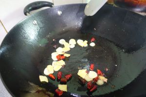 油锅中放入适量油放入切好的辣椒段、花椒略炒,放入姜葱蒜炒出香味