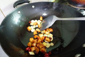 四,最后放入黄瓜丁,翻炒几下放入少许盐,因为郫县豆瓣酱就很咸了。勾芡,出锅!