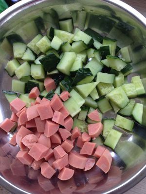 材料切成丁,因为我不喜欢吃红萝卜所以用了火腿