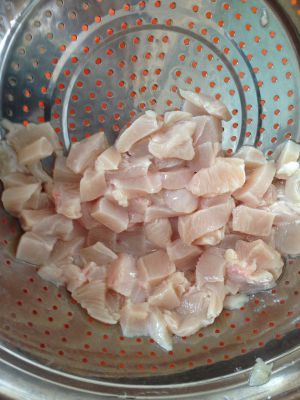 鸡肉也切成丁,用淀粉腌一下会嫩一点