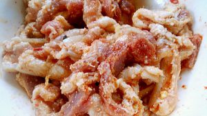 肉洗净,切片,加入剁碎的姜蒜末,豆瓣酱,老抽,香油,鸡精,白糖和花椒面。用手爪匀。