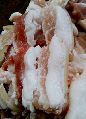 将五花肉切厚片,放入老抽,五香粉盐,姜片,葱段,拌匀,腌制放入冰箱腌制8小时以上