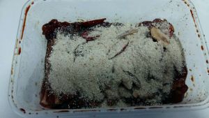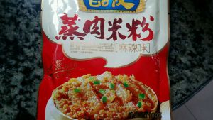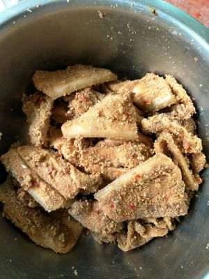 将腌好肉加入蒸肉米粉拌匀,米粉是自己提前做好的,一次可多做些放入罐子中保存