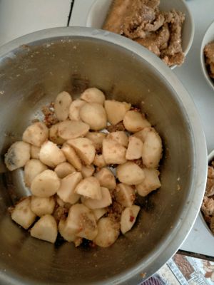 腌制入味的肉分批倒入蒸肉米粉,一边拌均匀一边倒入米粉,如果过干,可加适量清水