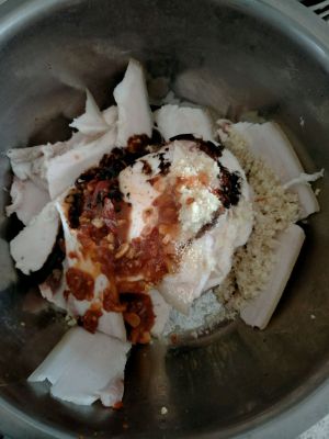 五花肉用老抽,生抽,花椒粉,盐抓匀,腌制。