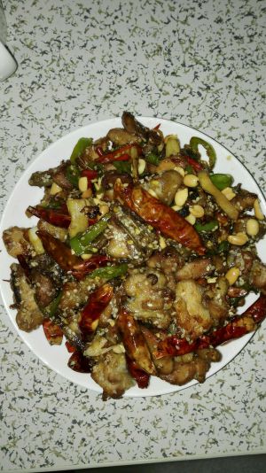 锅中放入油加热到150度放入鸡肉炸到有点金黄色捞起,再把锅中的油弄掉,加入一点油把蒜,红椒,一起先下锅,再放姜,花椒,干椒豆瓣酱炒一下,把鸡肉放下锅一起炒,炒到差不多把鸡肉都上色了,就放入青椒,葱再炒一下,放一点水焖一下
