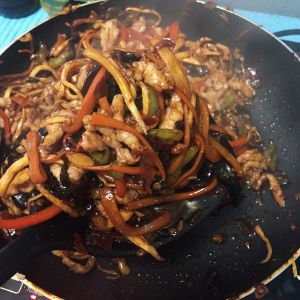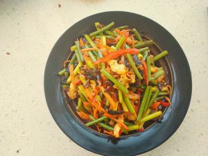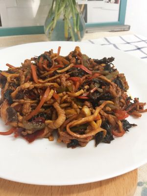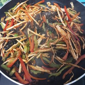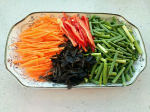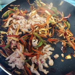 倒入备好的青椒丝胡萝卜丝木耳丝翻炒均匀