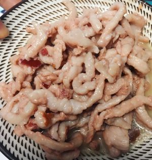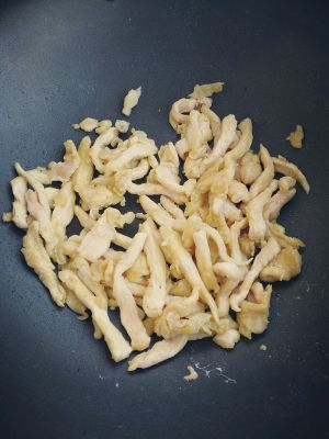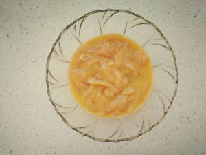 切成丝,放适量盐,糖,胡椒粉,生粉,鸡蛋,上浆
