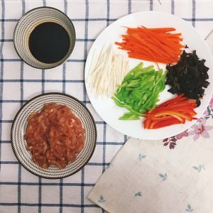 猪肉切丝(可以是里脊肉,今天买的是冒子肉,油气要重一点),加入淀粉1勺,生抽1勺,料酒1勺,拌匀后加入调和油适量静置10分钟。