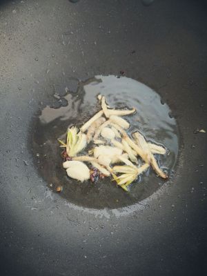 热锅凉油,下葱姜蒜丝,花椒八角,郫县豆瓣酱,翻炒出红油,下适量白糖