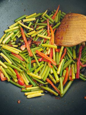 倒入青笋丝和木耳丝,翻炒一分钟。