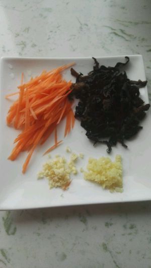 准备胡萝卜,木耳,葱,圆椒蒜切成丝状